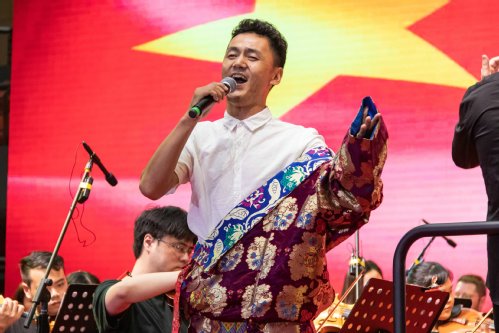演出以《北京喜讯传边寨》开场,富有浓郁的民族特点和地方色彩,生动明快的旋律极富感染力;校友李索南当智用藏区独特的唱腔深情演唱歌曲《天路》,歌声明亮开阔,撼动人心;黄仪演唱的《举杯吧,朋友》抒发了对朋友的真挚情谊;龙淼鑫演唱的《我爱你,中国》、李淑珍演唱的《祝福祖国》两首曲子歌词质朴无华,却有动人心魄的激情,将对祖国的热爱之情抒发得淋漓尽致;吕欣演唱的《芦花》婉转动听,传达着女子对爱人的想念和对祖国的热爱,也赞美了军人舍小家顾大家的付出精神;王一晴演唱的《青藏高原》歌声雄厚,为祖国的大好河山唱出最美的赞歌……