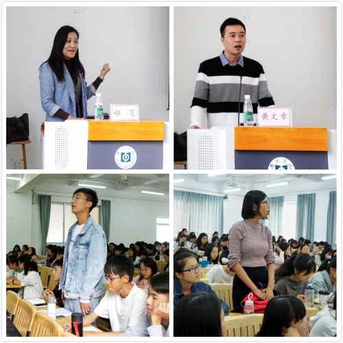 【本网讯】10月29日下午,我院卓越中学英语教师培养系列讲座第二十三讲在旭日大楼106课室顺利举行。邀请了我院2001级校友、现任惠州市华罗庚中学副校长郑雯和我院2002级校友、现任惠州市第一中学英语教师黄文章担任主讲嘉宾,辅导员唐波老师担任主持人,19级英语专业学生参加。