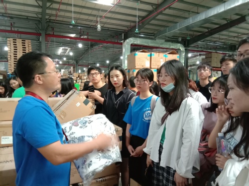 张伟平经理首先为同学们详细介绍了旭日集团物流仓储配送的全过程及功能,主要包括网仓和分拣系统。在他的带领下,师生一起参观了网仓,这个仓库主要为网店服务,分拣货品还是用传统的人手完成;然后,大家一起参观了华南物流中心自动分拣系统,该系统主要处理的业务有:自营出货、加盟/联营出货、澳洲真维斯出货、网店出货、返仓整理等。